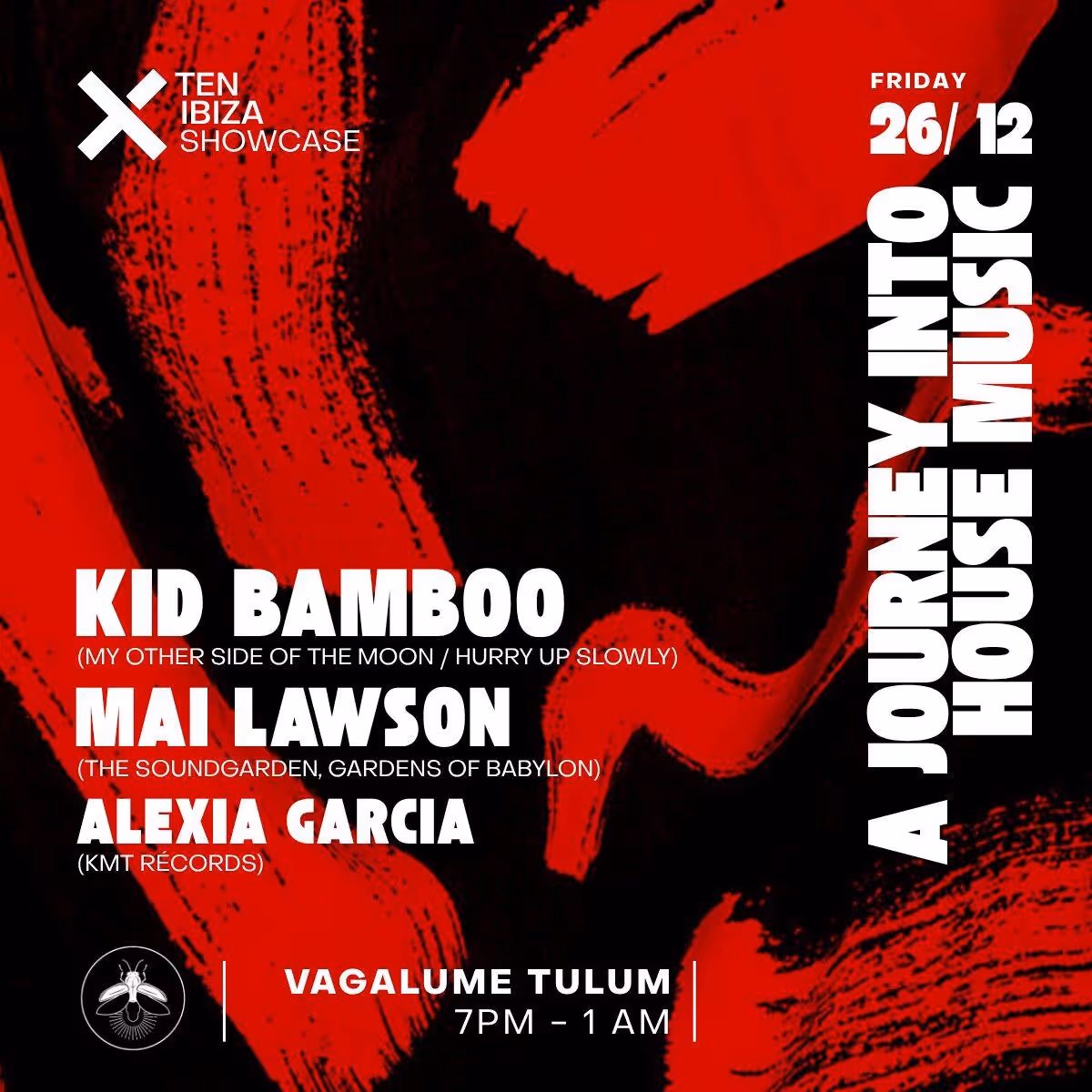 Ten Ibiza llega a Vagalume Tulum este mes de diciembre, trayendo una cuidada selección de selectores de la música house al lugar frente a la playa. KID BAMBOO, conocido por sus sets que mezclan house clásico con ritmos contemporáneos, aporta una energía impulsora a la pista de baile. El sonido característico de MAI LAWSON, que incorpora elementos de soulful y tech-house, añade una capa de sofisticación, mientras que las selecciones de ALEXIA GARCIA se inclinan hacia el lado más profundo y melódico del espectro.