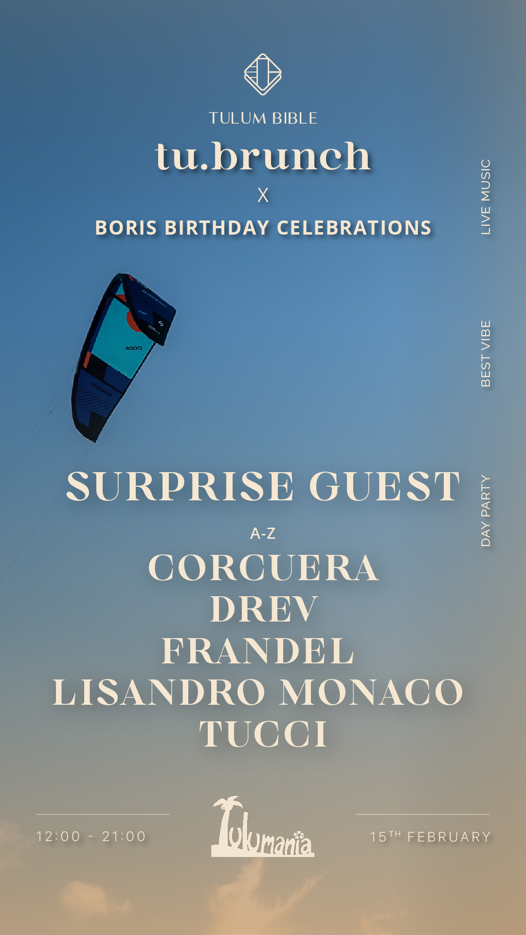 Tu Brunch x Boris Celebración de cumpleaños (la persona detrás de Tu Brunch y Tulum Biblia). Una edición especial de playa en Tulumania con Corcuera, Drev, Frandel, Lisandro Monaco, Tucci, Boris Cerka + un invitado sorpresa.
