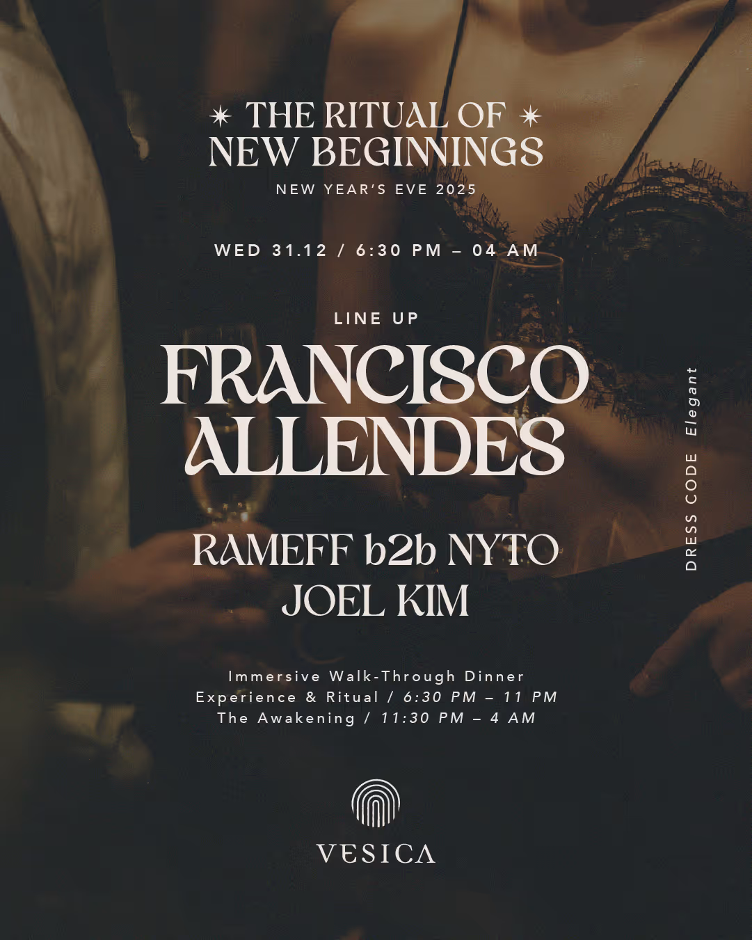 Francisco Allendes headlines the progressive DJ lineup at Vesica Tulum, with Rameff b2b Nyto warming up and Joel Kim providing dinner music.