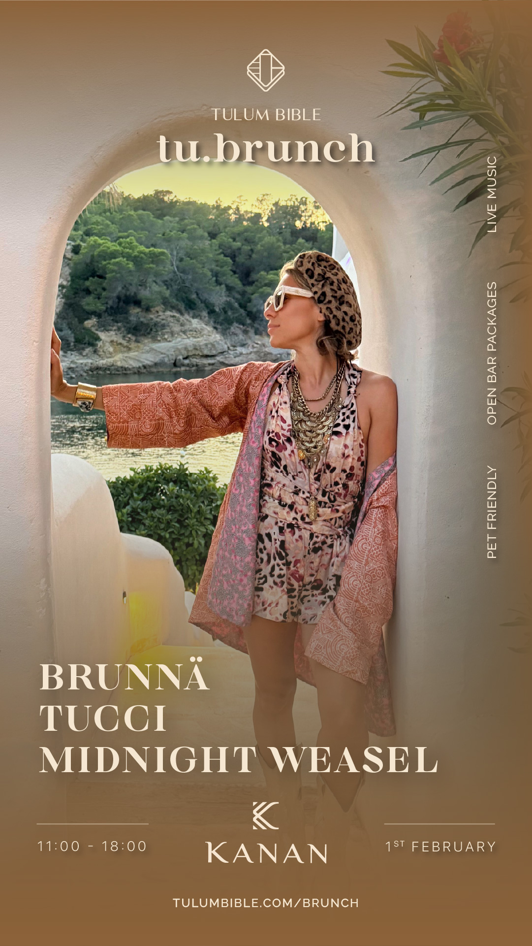 Tu Brunch returns this Sunday at Kanan with Brunna, Tucci and Midnight Weasel A perfect beach day on a Sunday. Limited free entry with open bar packages — reserve your spot.