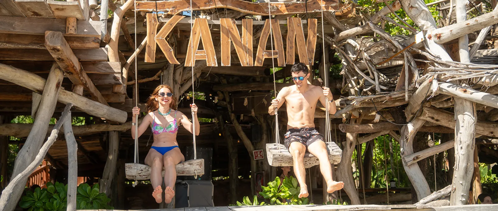 Kanan Beachclub is an adults-only venue with a restaurant, pool, and pet-friendly spaces, offering a relaxed jungle-meets-sea escape in the hotel zone.