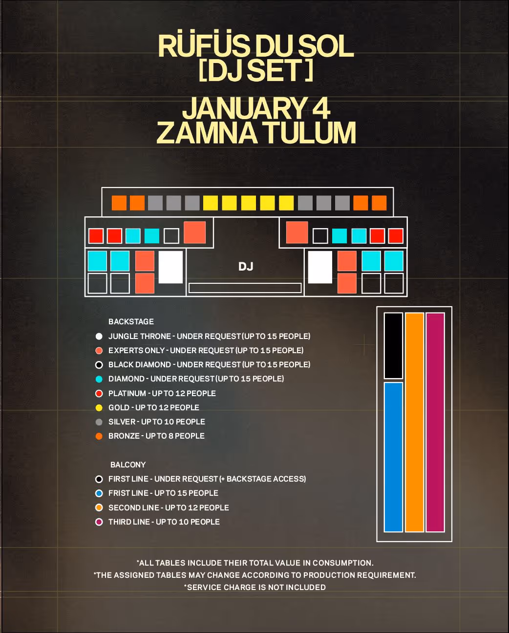 Tulum Bible is thrilled to offer VIP and Backstage table reservations for the most anticipated electronic music events in Tulum, Zamna. If you're looking for an elevated experience at Zamna, securing a table is the way to go. From Afterlife to Keinemusik and ARTBAT, tables provide priority access, premium service, and the best seats in the house for some of the most anticipated music events in Tulum. Our table reservation process is simple and seamless, ensuring you get the best experience at Zamna.